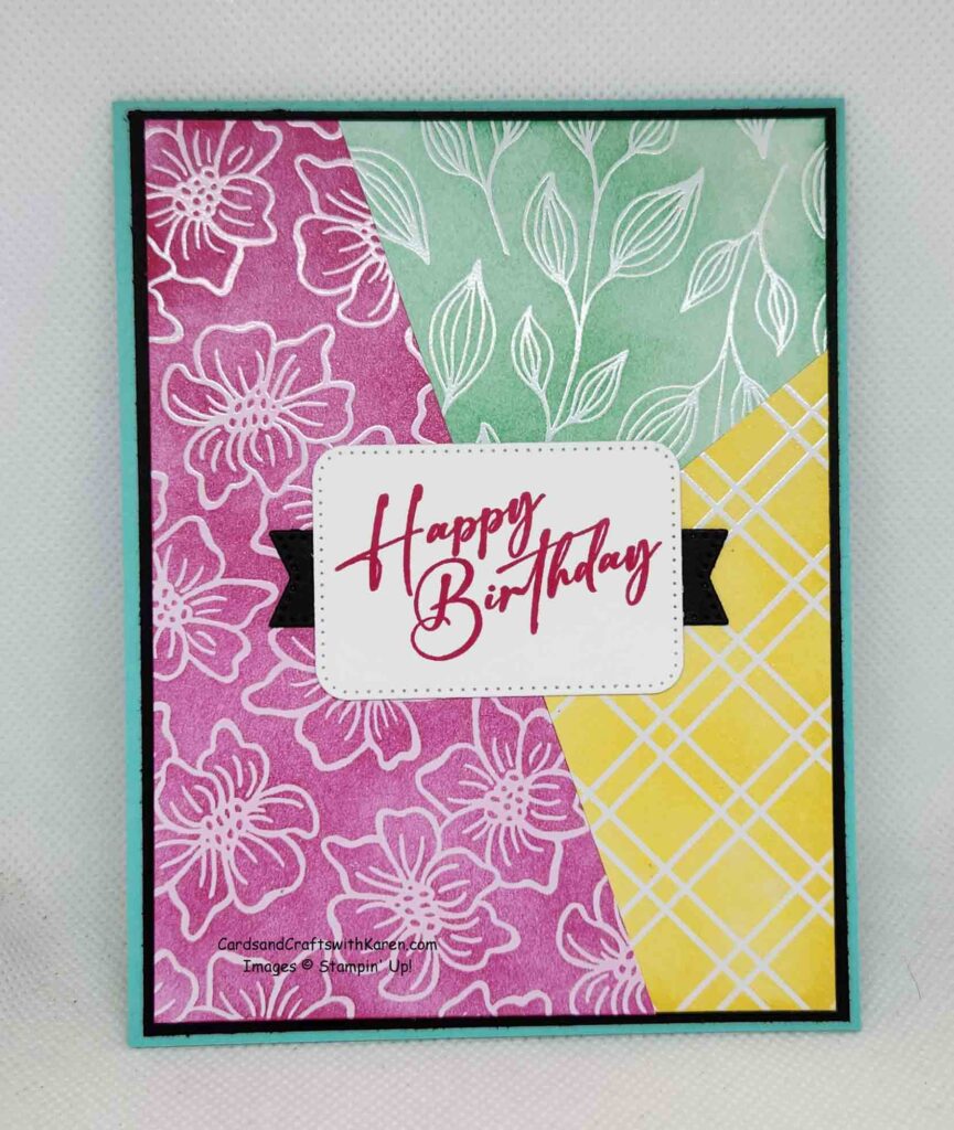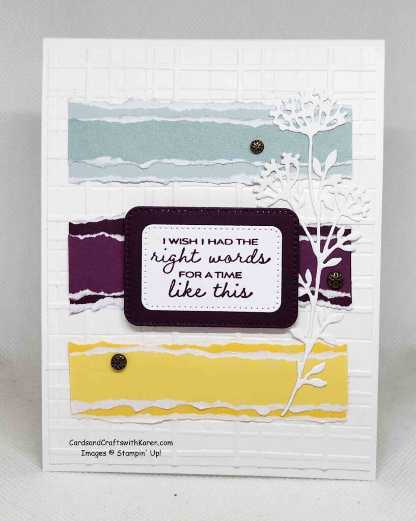 Each strip is 2″ x 4″ and teared along the long side to create the layers. Thick Basic White card base and embossed mat. Add greeting and die cut of your choice.