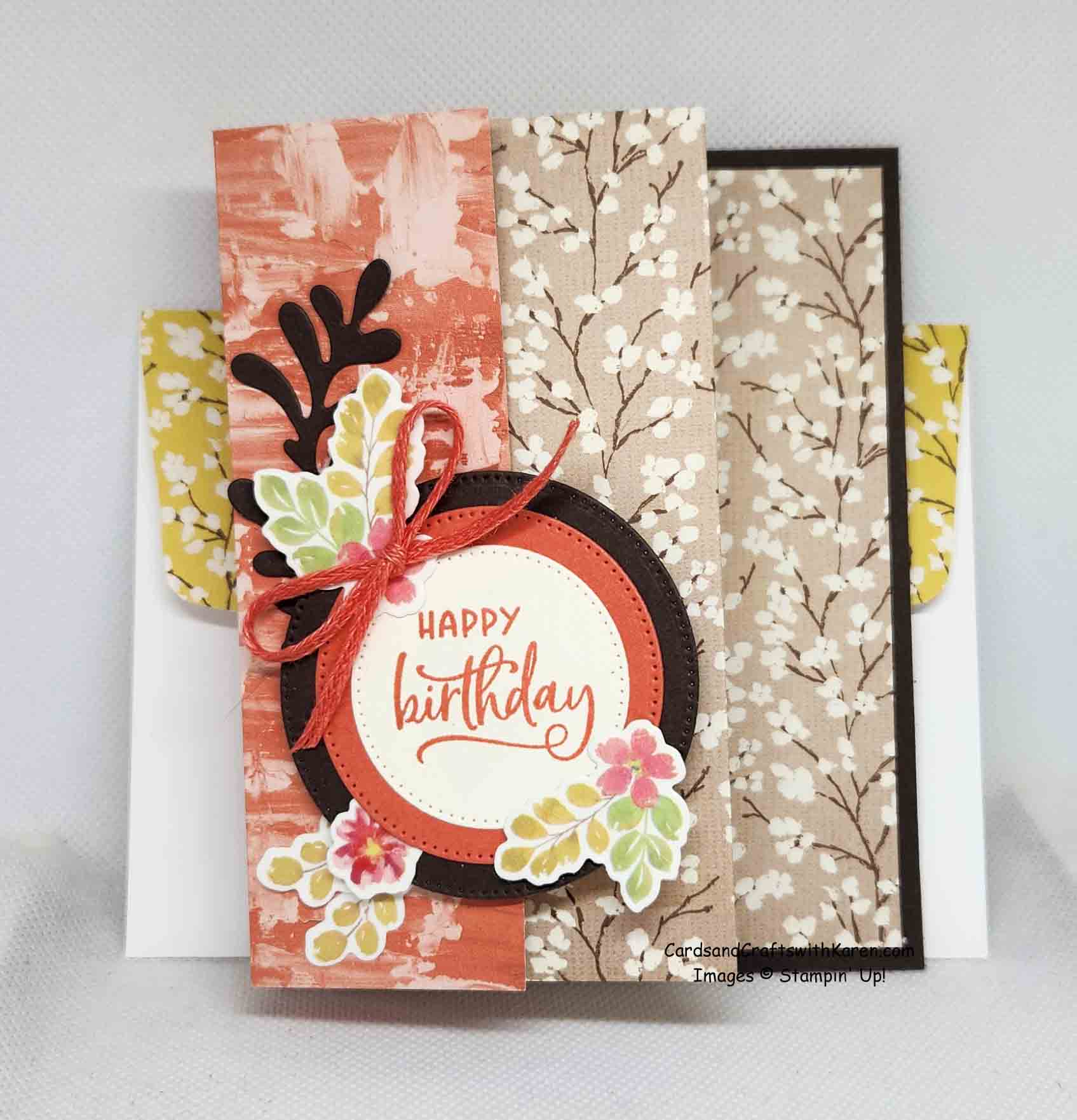 The fourth card is a fun fold featuring a 5¼” x 11½” piece of designer series paper scored at 1¾” – 4¾” and 7¾” then added to a 4¼” x 5½” card base. Coordinating piece of designer series paper has been added to the envelope flap.