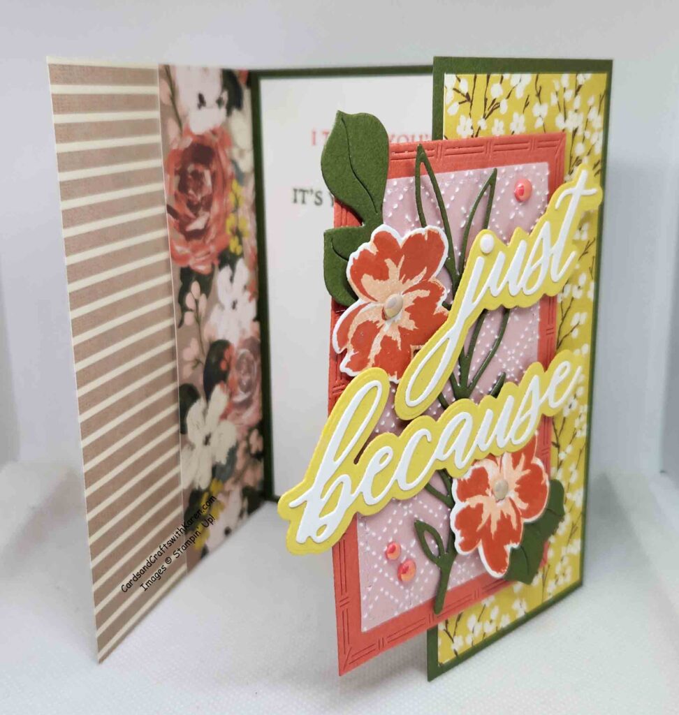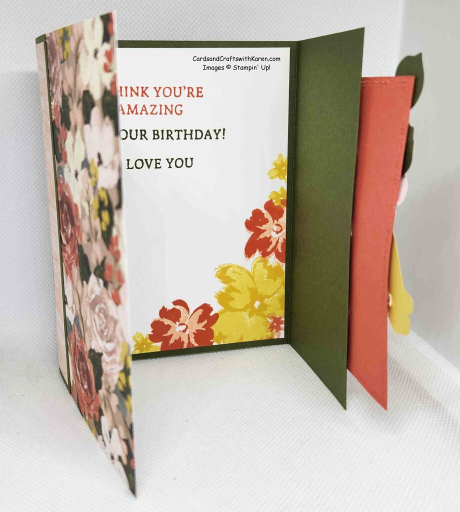 Finally, a side view of the card. On the designer series paper side is a pocket to hold a gift card or even cash, if needed. The designer series paper is 5½” x 6″ for a gift card holder or 5½” x 4″ if you don’t need the holder.