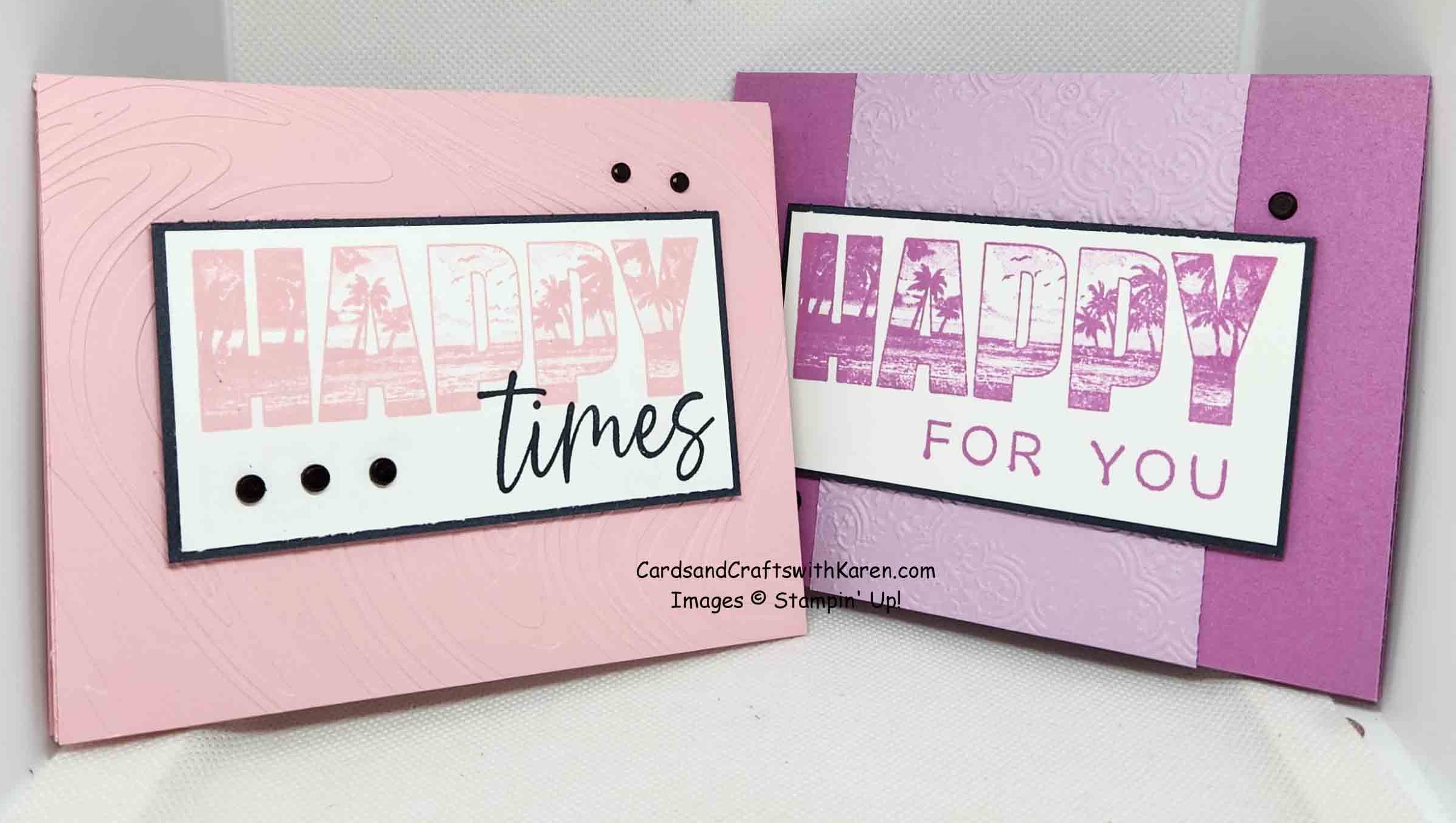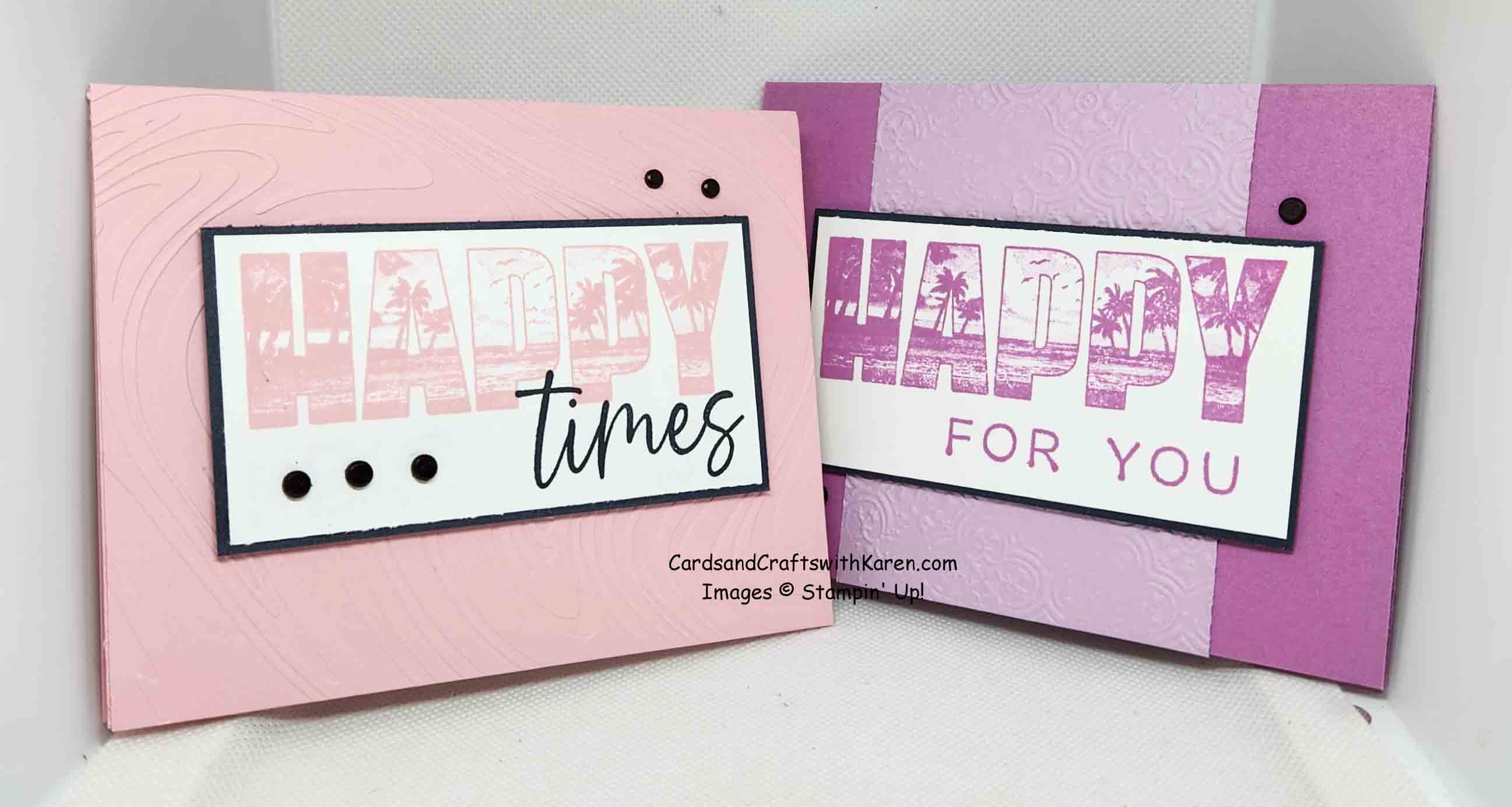 For each card “Happy” is stamped in the same color as the card base. Some cards have an embossed panel. Earthy Matte Dots where colored with the Dark Basic Black Stampin’ Blend Marker and added to the card as an embellishment.