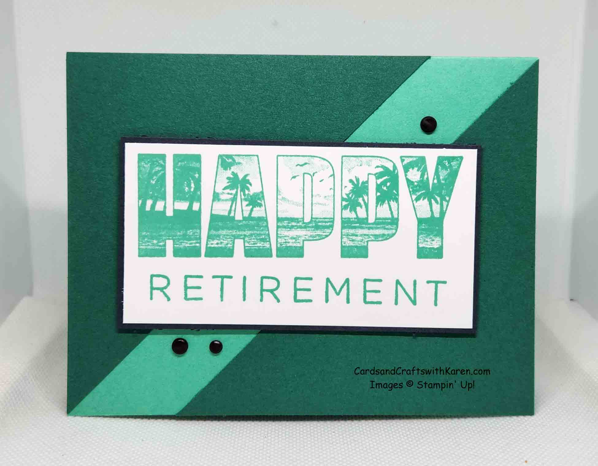 Finally, last card is a retirement card. The base is Shy Shamrock with a 4¼” x 4¼” square of Shaded Spruce cut on the diagonal then added for depth to the card.